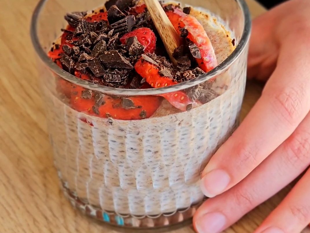 Questo chia pudding fragole e cioccolato fondente è un’idea pratica, sana e appagante per prendersi cura di sé fin dal mattino.
