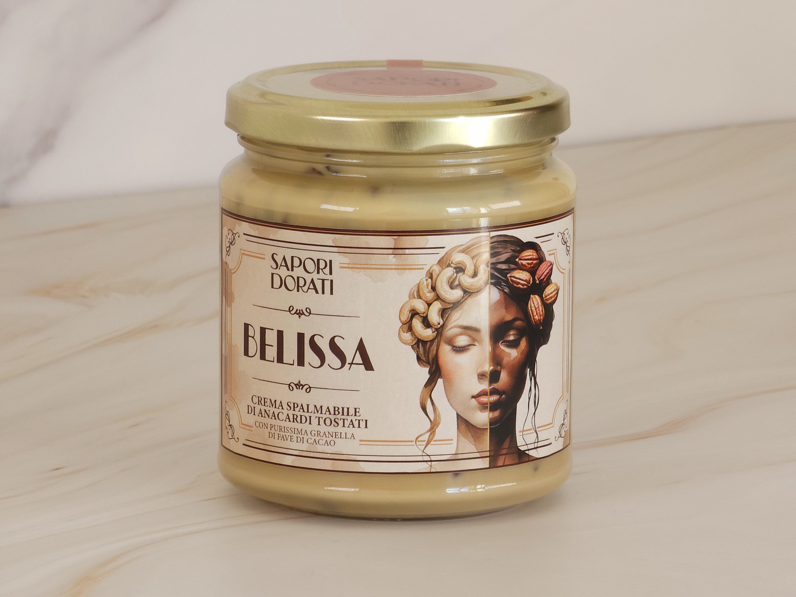 La Belissa è una crema spalmabile a base di anacardi tostati. Viene arricchita con granella di fave di cacao e miele. Il risultato è una crema naturalmente dolce, dal carattere intenso e dalla consistenza setosa e croccante.