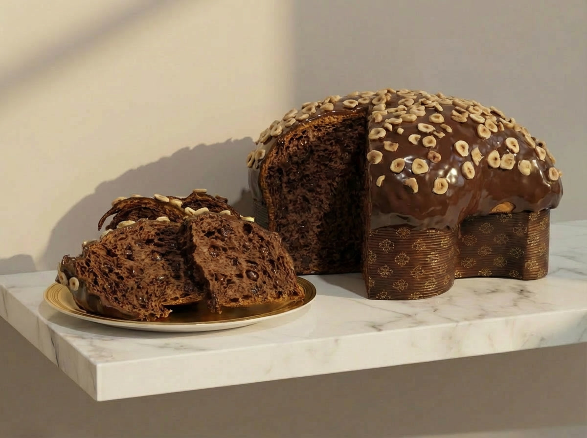 La colomba al cioccolato nasce dall’incontro tra la tradizione dei grandi lievitati pasquali e l’intensità del cioccolato fondente, dando vita a un dolce soffice, avvolgente e ricco di carattere. L’impasto al cacao, preparato con ingredienti di alta qualità e lavorato con cura artigianale, è arricchito da pepite di cioccolato fondente che regalano note profonde e golose. La lavorazione segue una lenta lievitazione naturale e prolungata che permette all’impasto di sviluppare sapori complessi e una consistenza morbida e incredibilmente leggera. L’alveolatura interna è ampia e regolare, indice di una lievitazione attenta, che rende ogni fetta soffice e capace di sciogliersi al palato. La cottura sprigiona profumi caldi e avvolgenti, dove il cioccolato diventa protagonista, la ricca glassa al cioccolato invece avvolge la colomba. A completare il tutto da nocciole tostate affettate italiane che creano un piacevole contrasto di consistenza, il croccante delle nocciole e delle pepite di cioccolato con il soffice dell’impasto. Ogni colomba è il risultato di una lavorazione artigianale attenta e paziente, dove ogni fase è curata nei più piccoli dettagli per offrire un dolce pasquale elegante e irresistibile.