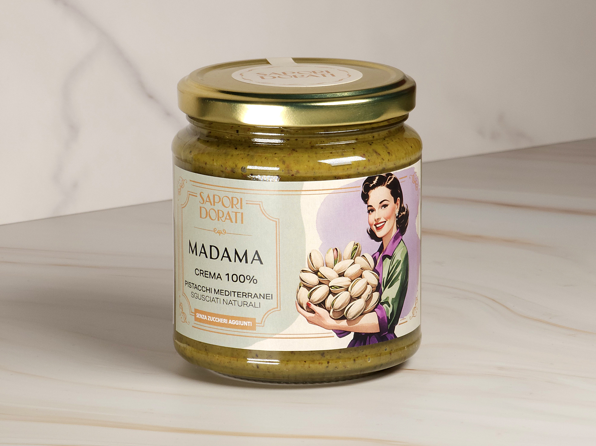 La Madama continua la tradizione della produzione delle creme 100% frutta secca. Senza zuccheri aggiunti, saporita e genuina, che attraverso una sapiente trasformazione delle materie prima dà origine ad un prodotto di altissima qualità, dal gusto ricco e da una consistenza ruvida e strutturata. Il processo ha origine dalla selezione attenta e minuziosa dei pistacchi, che vengono volutamente non tostati. Questa scelta ne conserva le caratteristiche nutrizionali, e garantisce alla Madama un colore intenso e naturale, una consistenza piena e una lavorazione grezza. Grazie alla purezza, si distingue per il perfetto equilibrio tra dolce e aromatico, esaltando la complessità e la profondità del sapore originale del pistacchio. La lavorazione a crudo e l’artigianalità del processo produttivo, rendono la Madama un prodotto esclusivo, capace di trasformare ed ingentilire ogni preparazione.