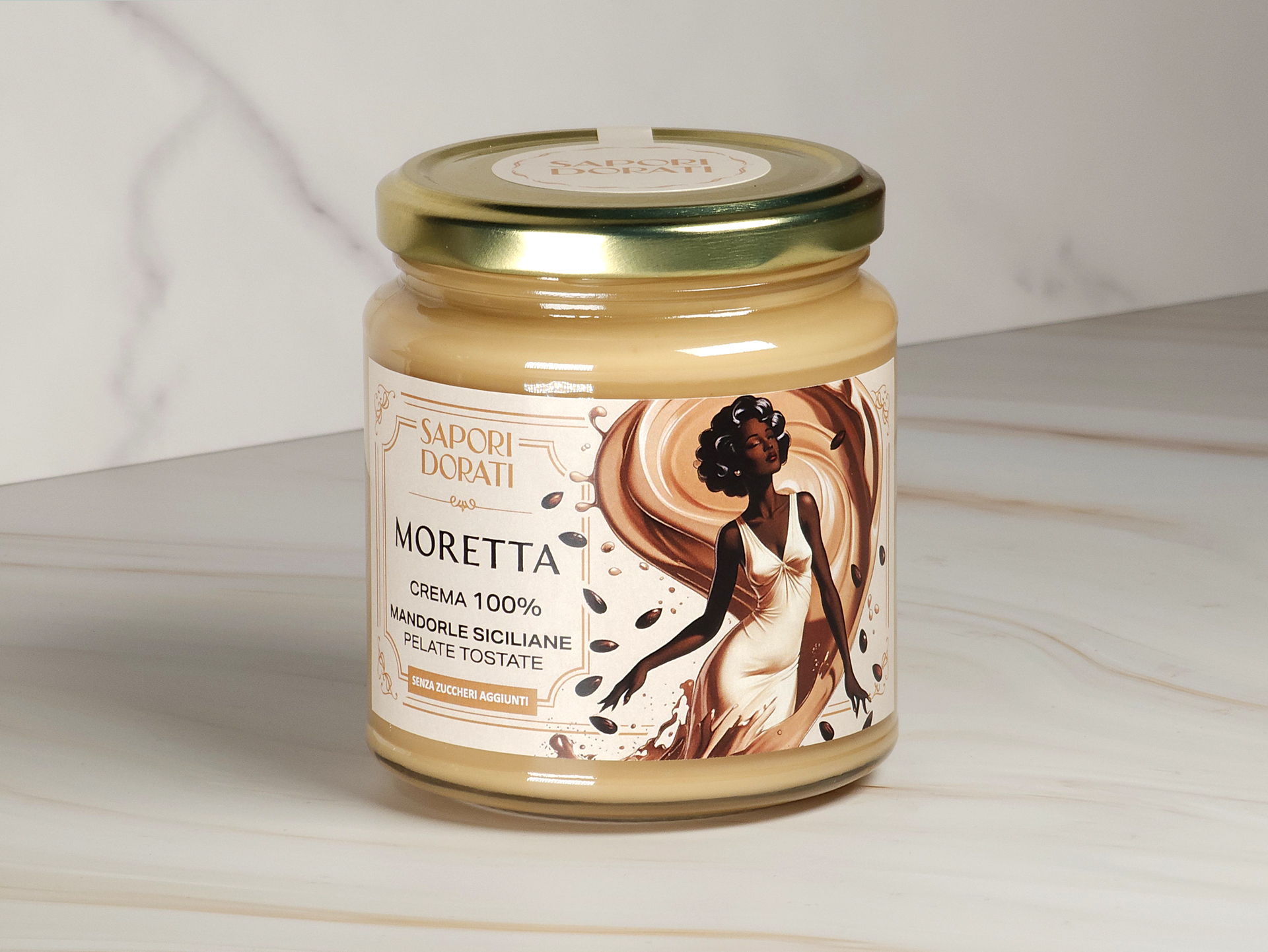 Per realizzare la Moretta vengono utilizzate solo ed esclusivamente mandorle siciliane. Dopo un’accurata selezione, quest’ultime vengono poi lavorate fino ad ottenere una pura pasta 100% mandorle pelate e tostate. La scelta della frutta secca siciliana dona un gusto autentico a questa crema e la sua lavorazione offre un prodotto dalla consistenza morbida e cremosa, senza rinunciare alla qualità.