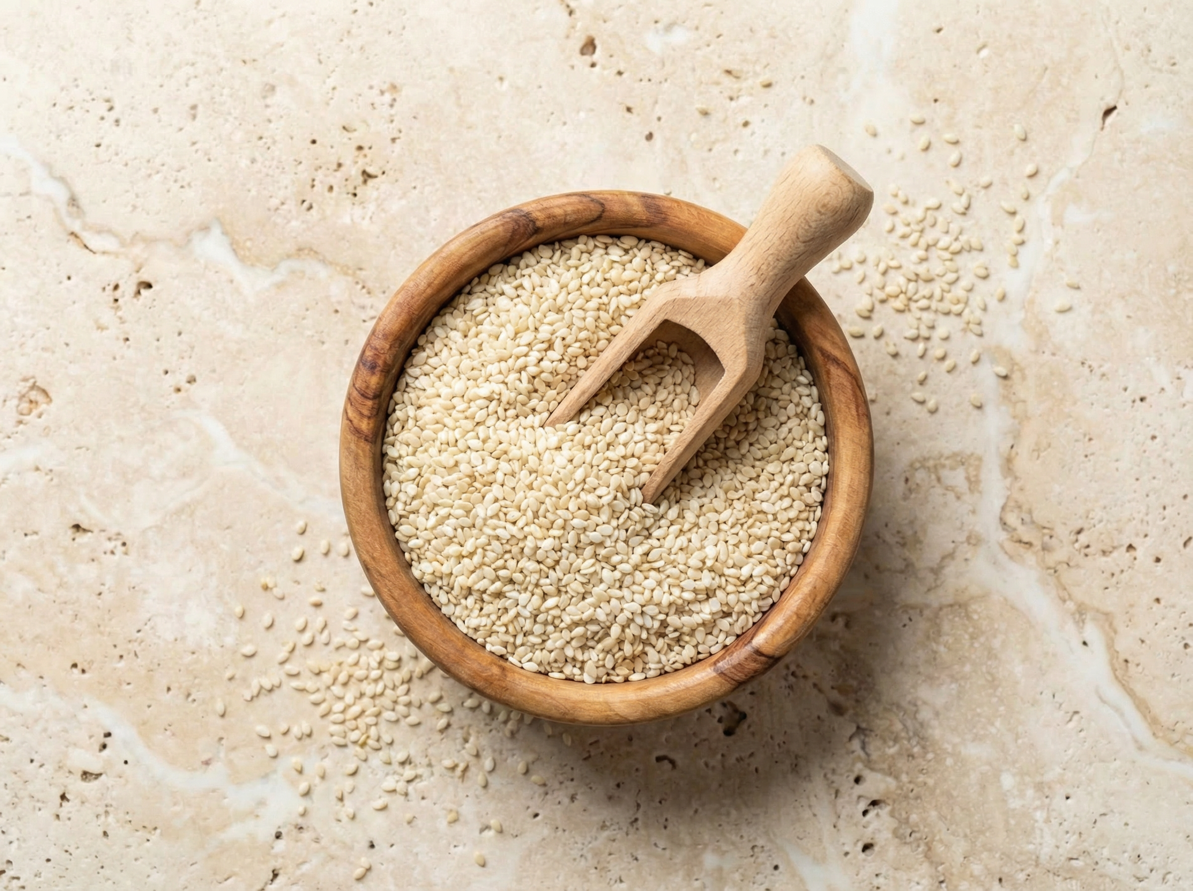 I semi di sesamo decorticati sono piccoli ma potenti alleati per una dieta equilibrata, si distinguono per il loro profilo nutrizionale ricco e bilanciato. La rimozione della buccia esterna li rende più digeribili, pur mantenendo la maggior parte dei preziosi nutrienti. Naturalmente ricchi di acidi grassi insaturi, in particolare acido oleico e linoleico (Omega‑6), i semi di sesamo contribuiscono al mantenimento di livelli normali di colesterolo nel sangue, a beneficio della salute cardiovascolare. Contengono una buona quota di proteine vegetali, importanti per il mantenimento della massa muscolare e ideali per diete vegetariane e vegane. Il sesamo è tra le migliori fonti vegetali di calcio, utile per ossa e denti, oltre a fornire ferro, magnesio, fosforo, zinco e rame, coinvolti in numerose funzioni vitali dell’organismo, dal metabolismo energetico al corretto funzionamento del sistema nervoso e immunitario. Nonostante la decorticatura, apportano una discreta quantità di fibre alimentari, che supportano il benessere intestinale e favoriscono il senso di sazietà. Sono inoltre una fonte naturale di antiossidanti con proprietà protettive contro lo stress ossidativo.